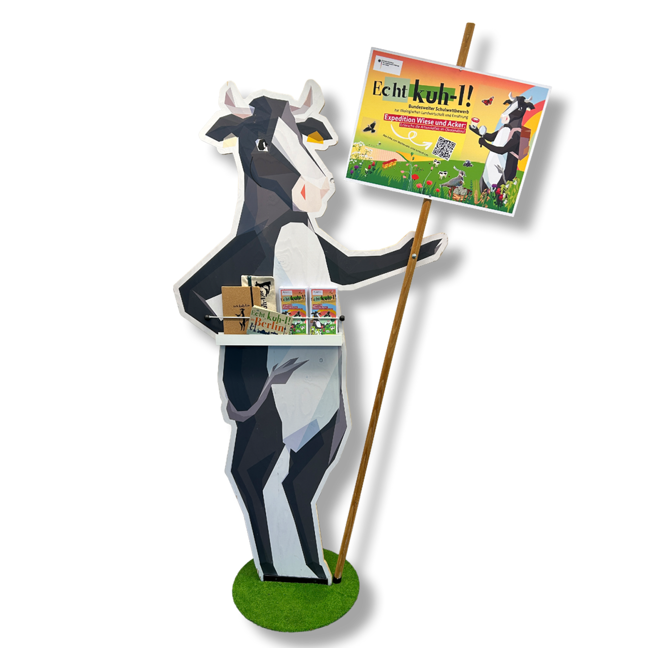 Die Kuh-le Kuh, das Ausstellungsexponat zum Schulwettbewerb, tourt wieder durch Deutschland. Immer mit dabei: ihre Schubkarre mit Touchscreens, um über den "Echt kuh-l!"-Wettbewerb zu informieren.